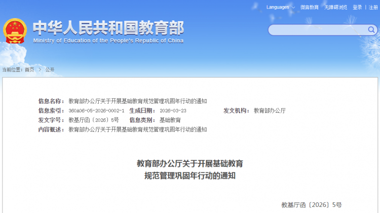 近日,教育部发布《关于开展基础教育规范管理巩固年行动的通知》(以下简称《通知》),将围绕教育公平、日常管理、办学治校、校园安全、教育生态五大核心方面开展专项巩固行动,持续规范基础教育办学行为。